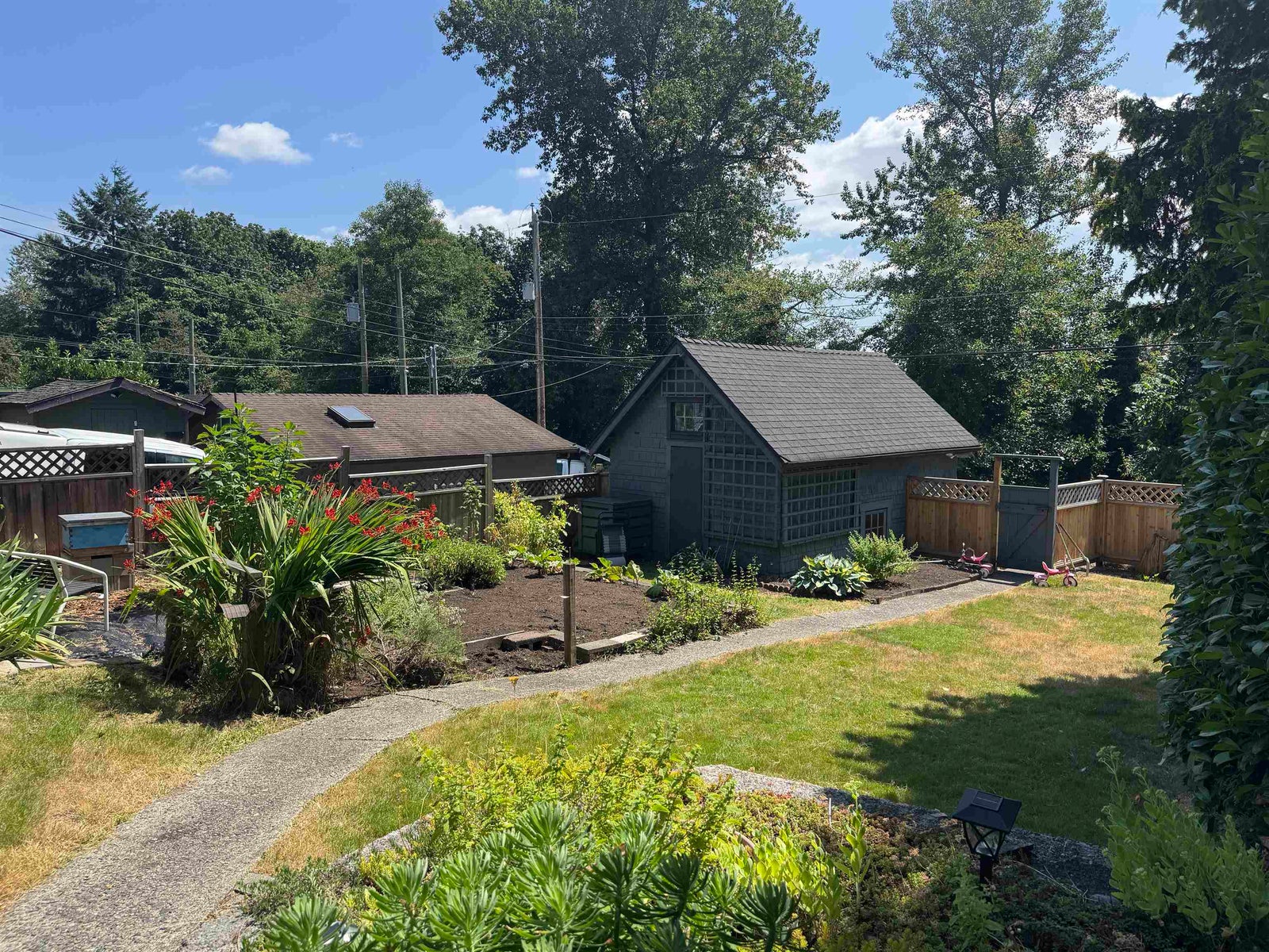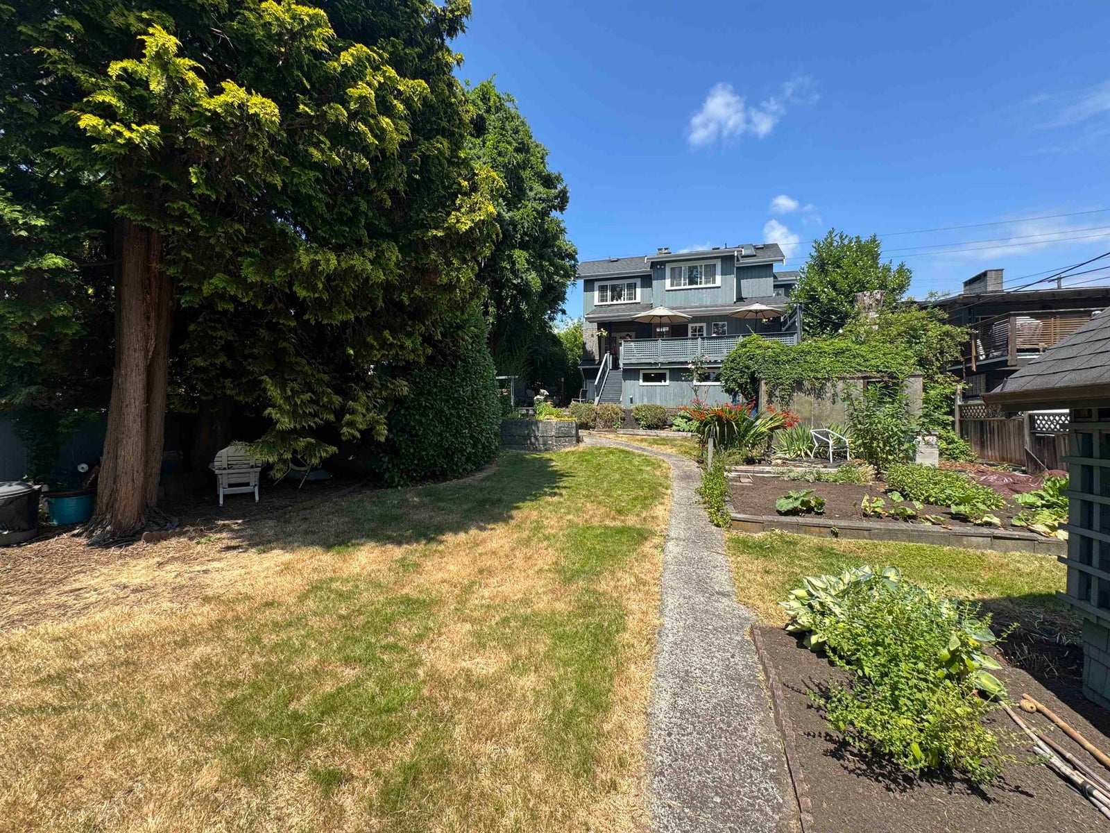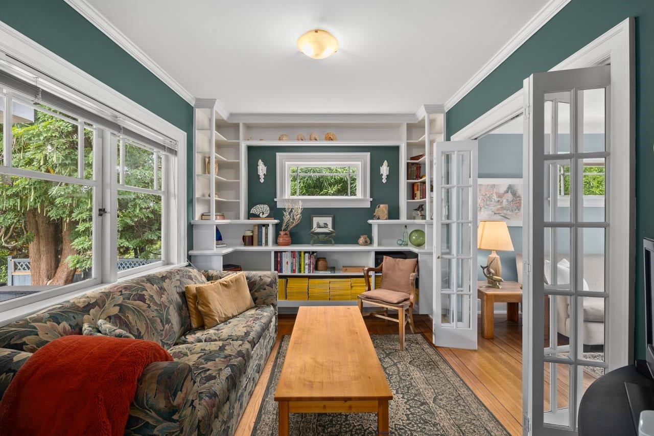 An absolutely charming home built in 1928 with addition/renovations in 1994 with some original features, heaps of privacy, and tons of possibility. The sunny deck and backyard have plenty of space for veggie gardens and a carriage house with no sacrifice on space. There are 2-bedrooms up and the option for a 3rd in the open flex space with a full bathroom on each floor. A final bedroom is on the lower level off the large family room. With a generous kitchen pantry, basement storage room, detached garage and over-sized closets, there is storage galore and a workshop under the deck too! The 2-level original garage off the back laneway has space for one car or a laneway house conversion.